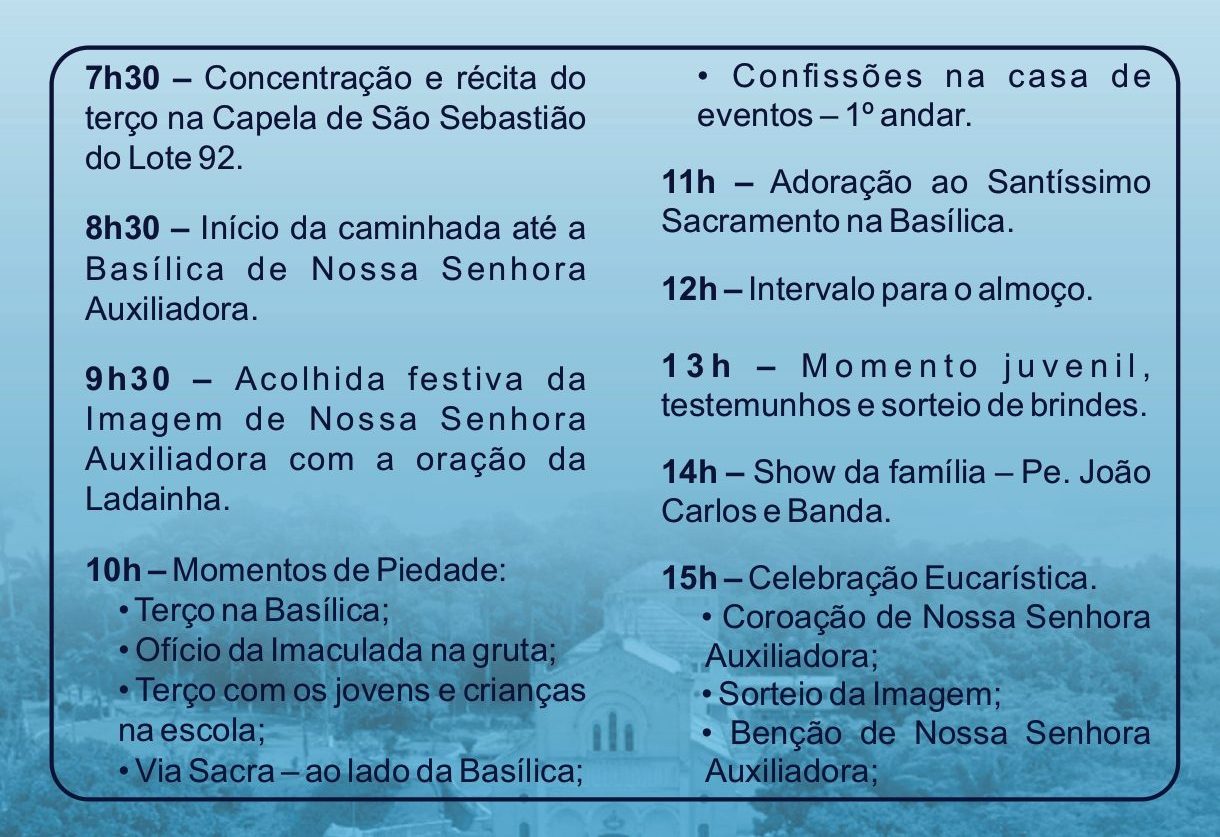 Jaboatão/PE e de todo o Nordeste Salesiano. A Romaria proporciona momentos de diálogo mais íntimo com o Pai e com os irmãos e irmãs; assim, por meio das práticas de piedade, vamos ter: Confissões, Récita do Terço Mariano e da Misericórdia; Adoração ao Santíssimo Sacramento; Ofício da Imaculada; concluindo com a Santa Missa e com a coração da imagem de Nossa Senhora Auxiliadora. Reunirmo-nos em torno da Mãe Auxiliadora, em sua casa, na Basílica da Colônia, que é sinal da unidade e do testemunho de fé para todos os jovens.
