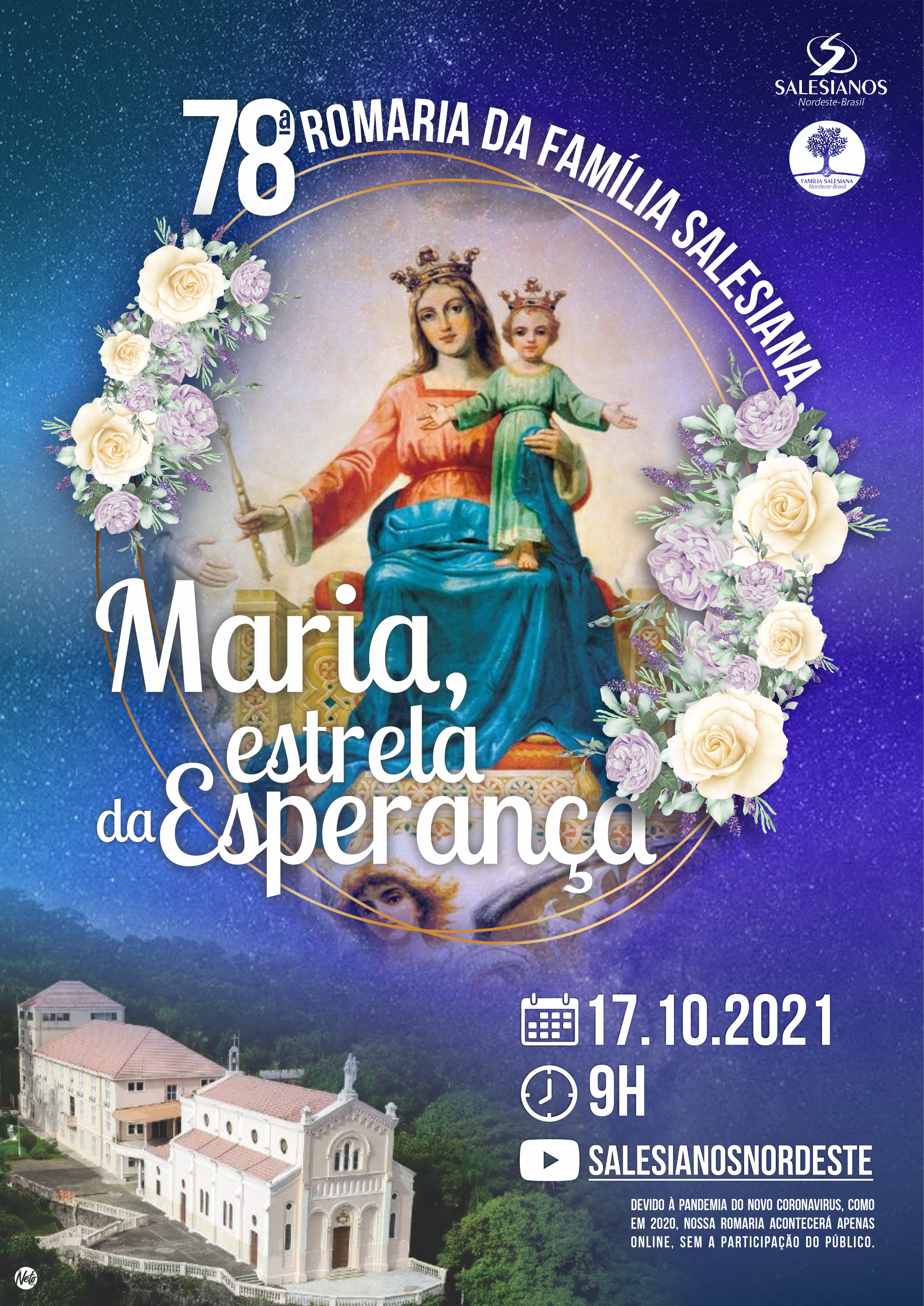 Como eu disse anteriormente, a Romaria desse ano também acontecerá toda online, será no dia 17/10/2021, transmitida pelo canal da Inspetoria dos SDB no YouTube e começará às 9h.
