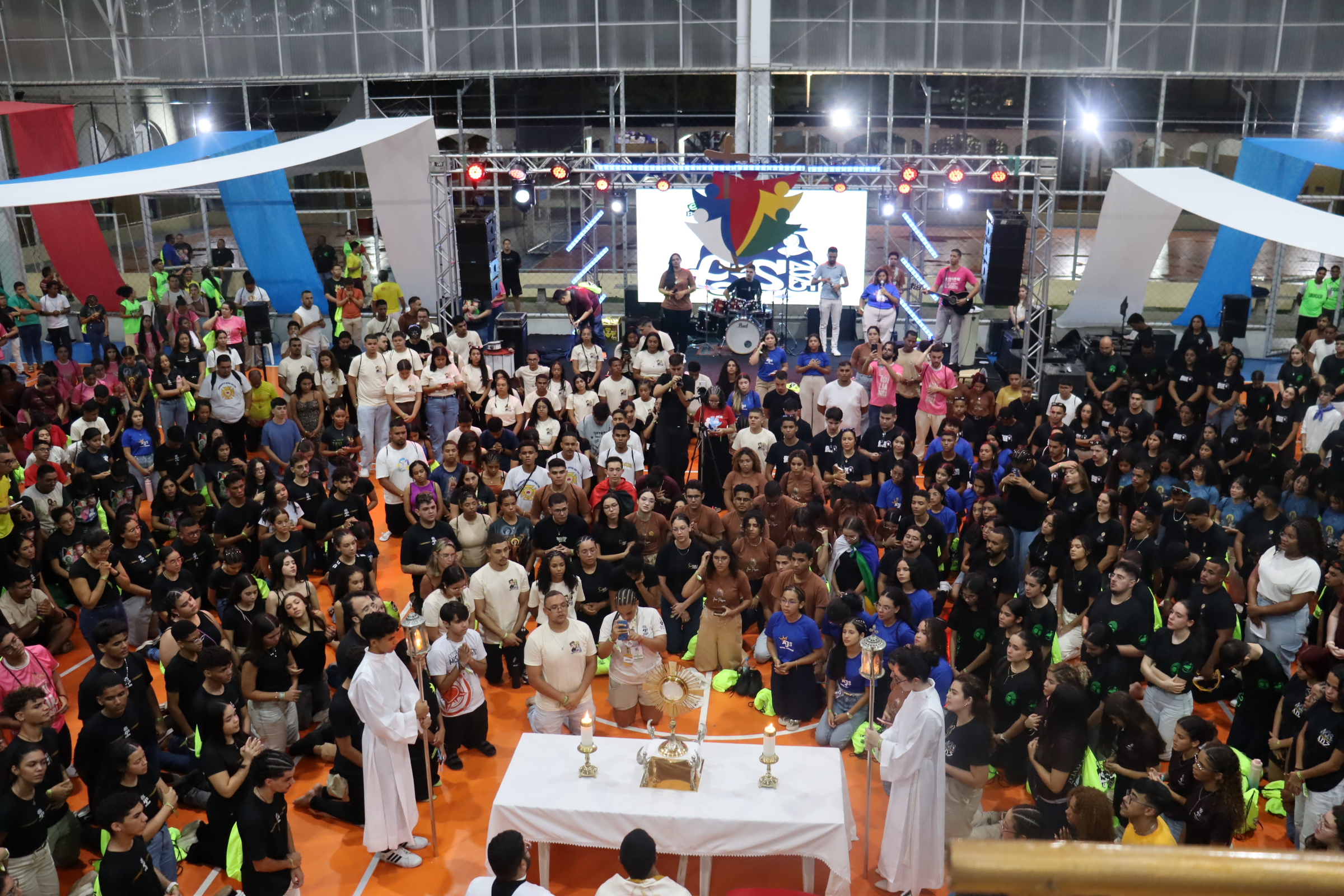 Na sequência, a Adoração ao Santíssimo, conduzida pelo Pe. Josemar Abel, envolveu a juventude em um silêncio orante e cheio de unidade. Foi um momento forte, daqueles que renovam forças e alinham o coração com o propósito da festa.