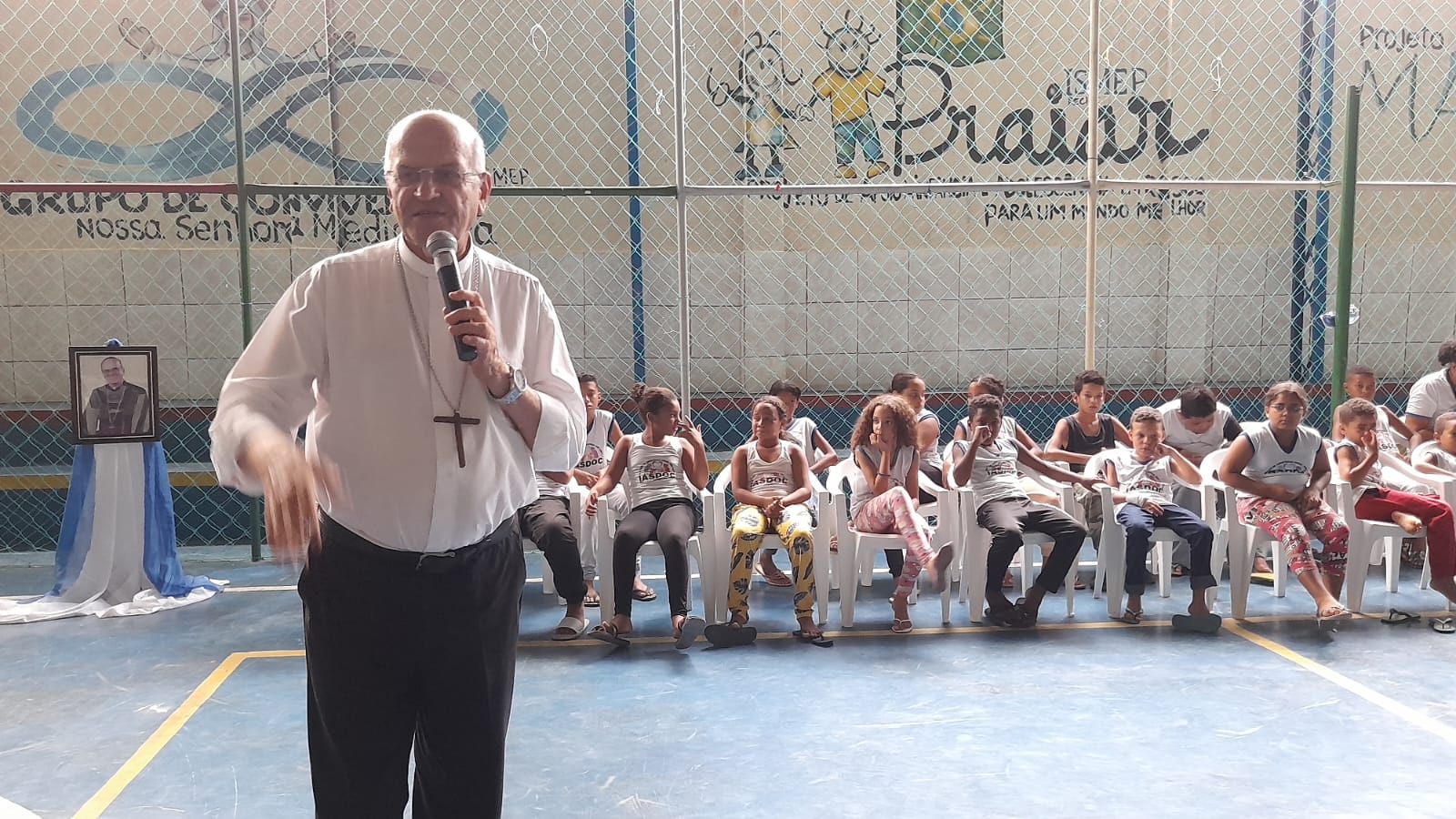 Não é fácil a gente ter que conseguir alimentos todos os dias para 240 crianças (metade no turno da manhã e metade no turno da tarde), 120 idosas, que muitas vêm buscar algo por não ter nada em casa. Então, a Campanha da Fraternidade deste ano, sobre a questão da Fraternidade e Fome e o Lema: “Dai-lhes vós mesmo de comer”; eu espero que toque, sobretudo, nos corações mais endurecidos. Um pão partilhado é muito mais gostoso. Eu acredito que a presença da Arquidiocese, na pessoa de Dom Fernando, é um presente de força, de esperança, que não nos deixa esmorecer; porque quando a gente vê a força dele, nos sentimos ainda mais animadas.”. A visita rendeu momentos de Graças, de bênçãos de Deus e de muitas emoções. Muito gratificante para nós, Irmãs, e para os nossos assistidos: Crianças, adolescentes, jovens, famílias e idosos que não param de falar na simplicidade, carinho e atenção de Dom Fernando para com todos.