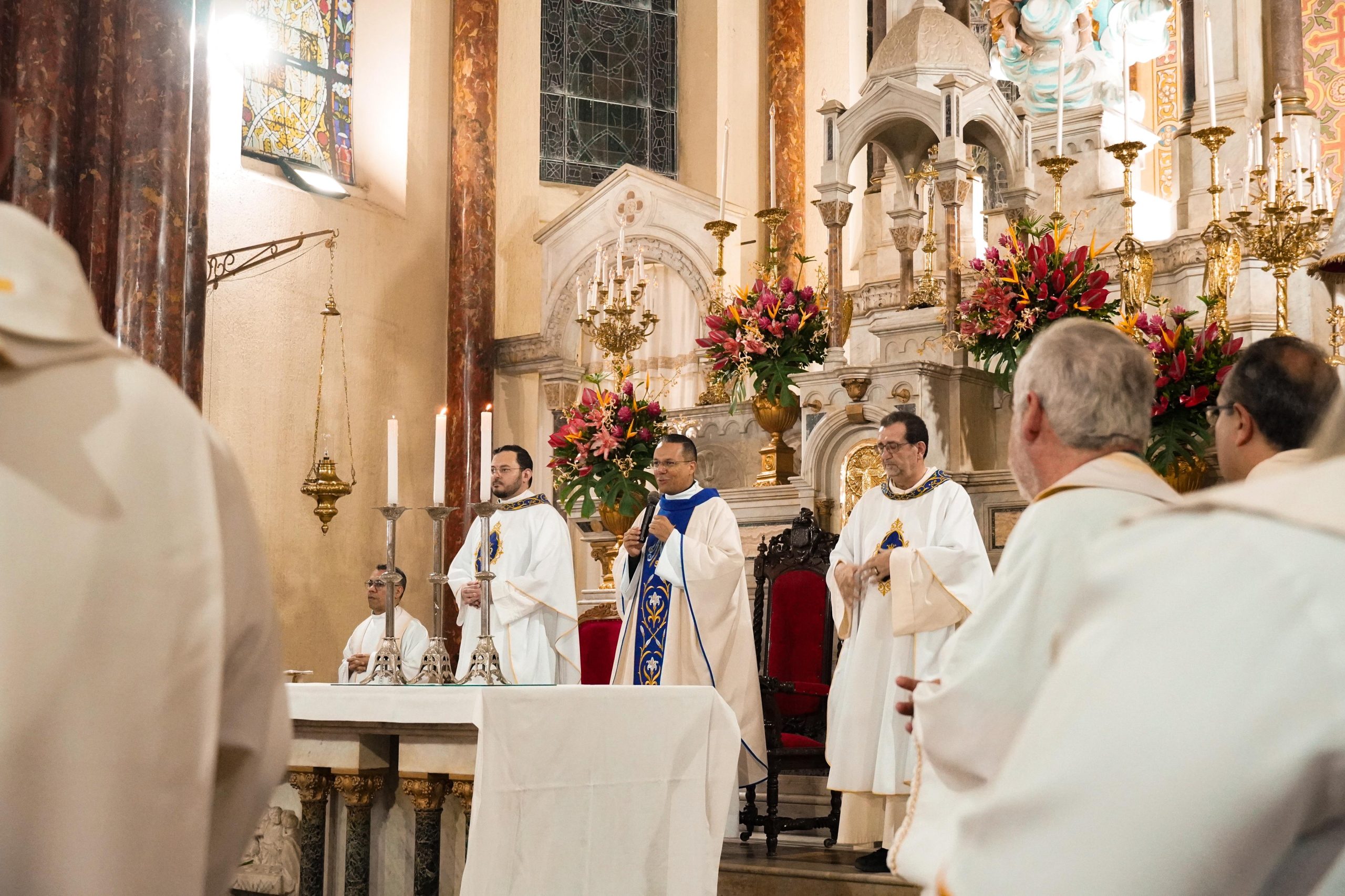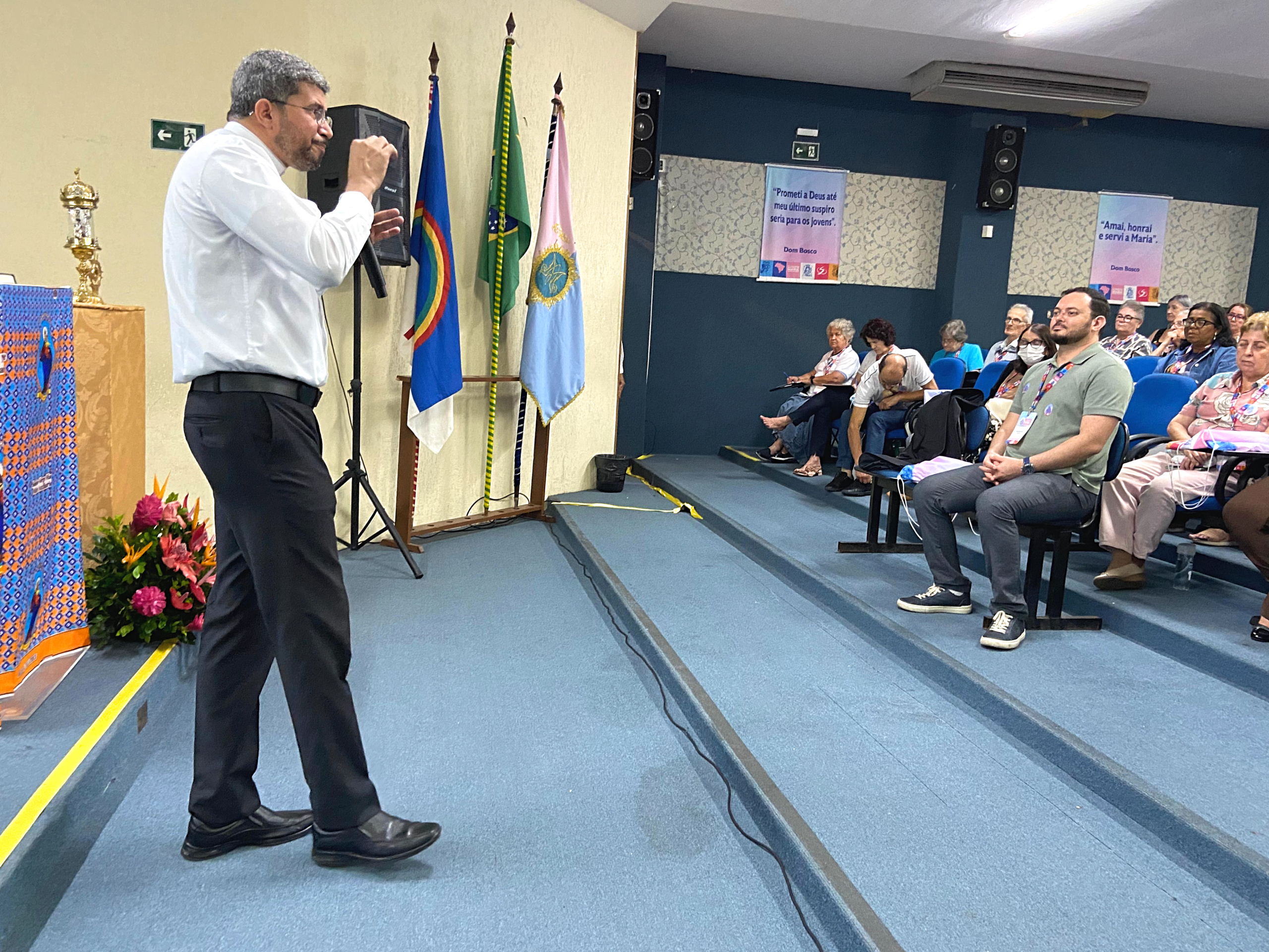 Na sexta-feira, o dia iniciou com a oração comunitária e as saudações de “Bom dia”, marca tão característica do estilo salesiano. A primeira palestra, Maria Virgem Orante, conduzida pelo Pe. Edson Donizetti Castilho, trouxe reflexões profundas sobre a Mãe de Jesus como Mulher de Oração, exemplo para todo cristão. Na sequência, os grupos se apresentaram por Inspetoria, criando um mosaico vivo da presença salesiana no Brasil. O Auditório João Paulo II, do Colégio Salesiano Sagrado Coração de Jesus, acolheu, em seguida, o vídeo de saudação do Reitor-Mor e da Madre Geral das FMA, que, mesmo à distância, fizeram-se próximos com suas palavras de encorajamento. O Pe. Fábio José de Farias Leite conduziu a segunda palestra, “Maria Auxiliadora: Discípula da Esperança”, unindo teologia e devoção popular. O dia encerrou com um profundo momento de Adoração Eucarística.