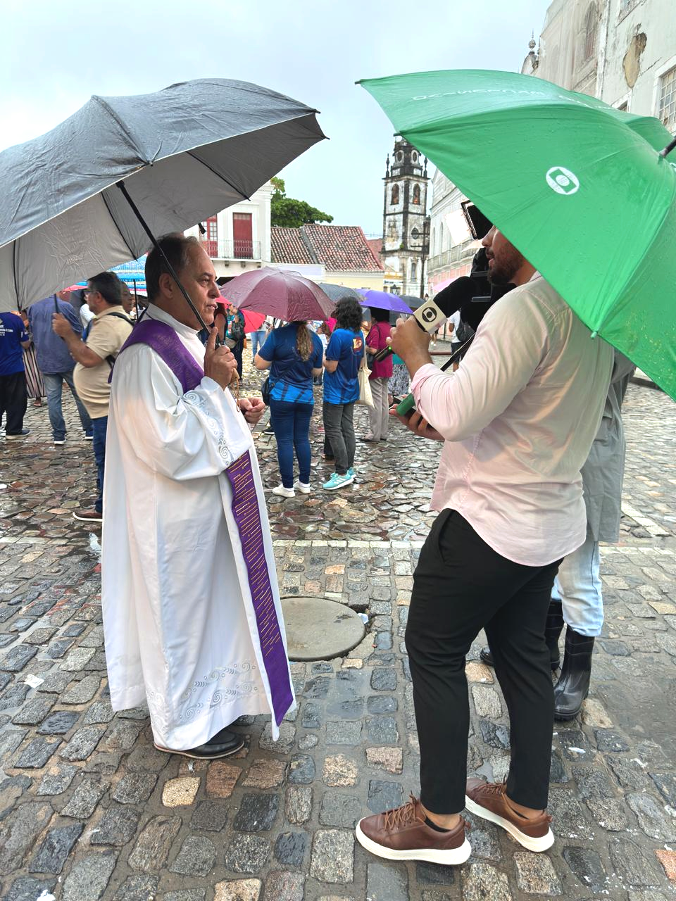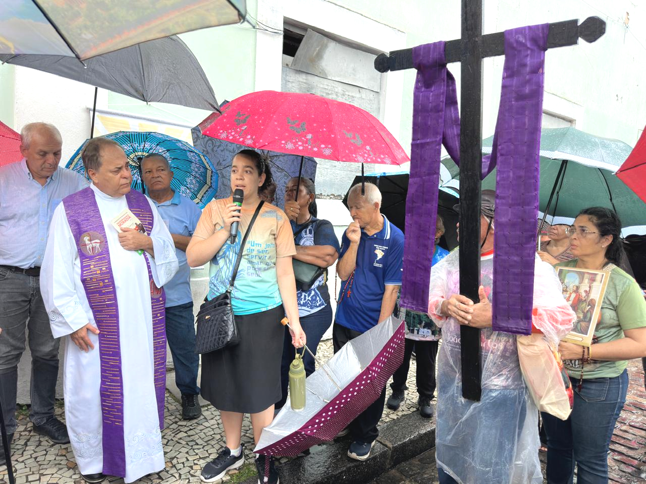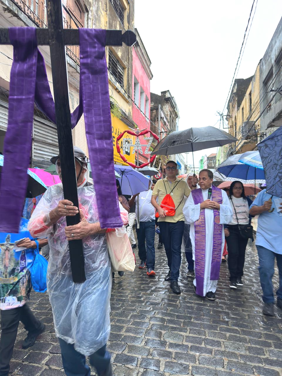Comunicação 1 de abril de 2026 Por pauloA 27ª Via-Sacra da Fraternidade, no centro comercial do Recife, amanheceu marcada pela chuva forte da Quarta-feira Santa (1º de abril) — e, ainda assim, não perdeu o essencial: a fé que caminha. Diferente das 26 edições anteriores, o percurso não seguiu todo pelas ruas como de costume. A tradição precisou se adaptar: a comunidade se reuniu no Pátio de São Pedro, onde antes do início foram dados vários giros rezando o terço. Em seguida, aconteceu ali mesmo a reflexão da 1ª estação.