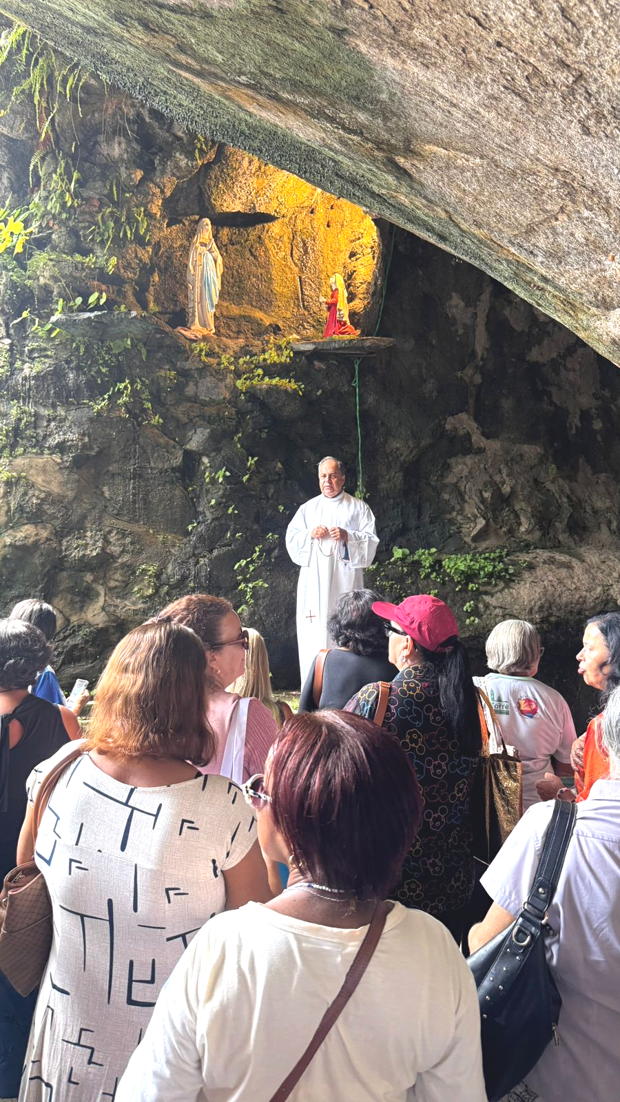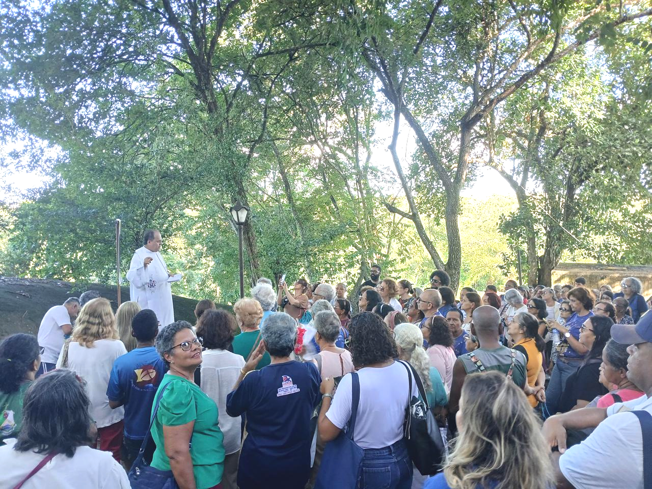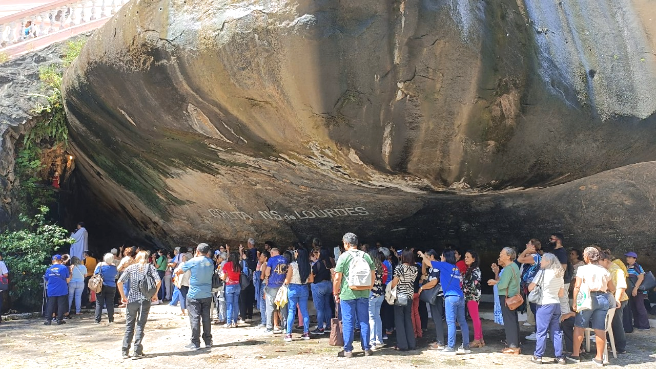 A programação teve início com a celebração da Santa Missa, presidida pelo padre João, na Basílica centenária, localizada em cima de uma grande rocha. Em seguida, todos foram convidados à oração do terço, na gruta de Nossa Senhora de Lourdes, que fica abaixo dessa mesma rocha. Um cenário inspirador de contemplação e de encontro com Deus.