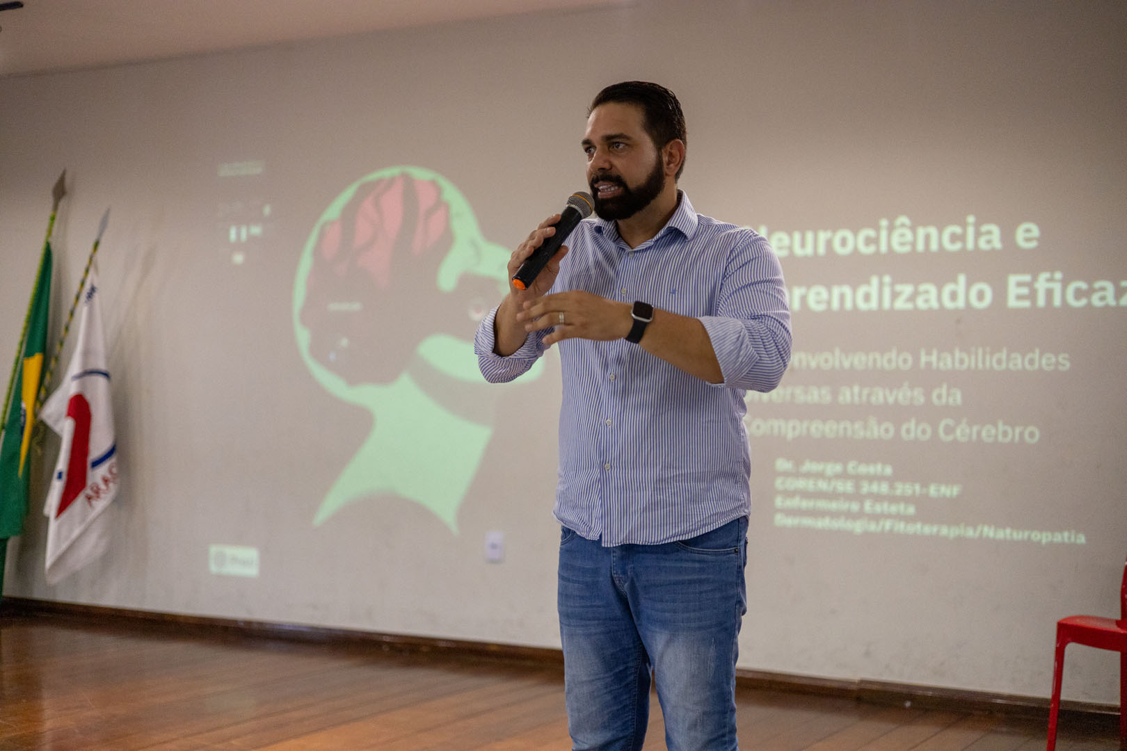 A palestra abordou duas temáticas importantes para os estudantes: “Neurociência e múltiplas habilidades” ministrada pelo diretor do Campus de Medicina – UFS Lagarto, Prof. Dr. Makson Oliveira; e “Neurociência e aprendizado eficaz”, apresentada pelo professor e enfermeiro Jorge Costa.
