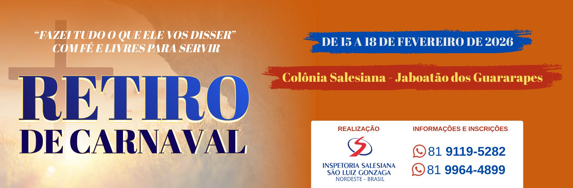 Comunicação 20 de janeiro de 2026 Por paulo“Fazei tudo o que Ele vos disser” Com fé e livres para servir – é o tema que iluminará o Retiro de Carnaval da Inspetoria Salesiana do Nordeste, que acontecerá de 15 a 18 de fevereiro de 2026, do domingo de Carnaval à quarta-feira de Cinzas, na Casa de Encontros de Jaboatão-Colônia (PE).