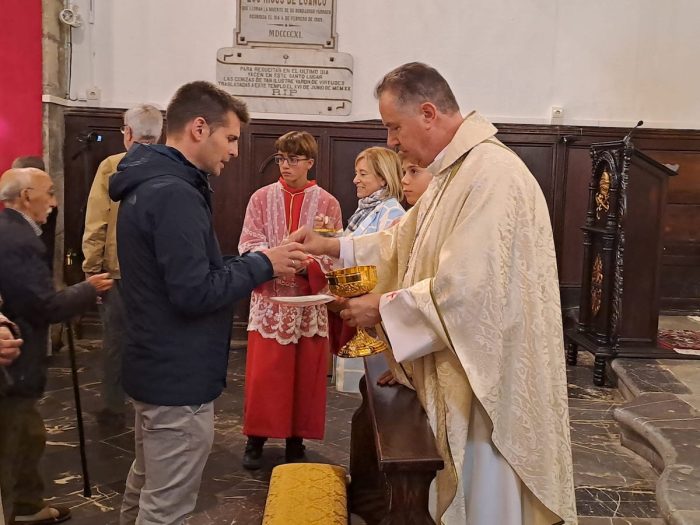 Os sinos tocaram ao meio-dia, anunciando a celebração da primeira Missa do P. Ángel Cardeal Fernández Artime em sua cidade natal, onde dezenas de paroquianos e vizinhos o aguardavam, bem como o Prefeito da cidade e alguns vereadores. A igreja estava superlotada de fiéis, todos moradores da região.