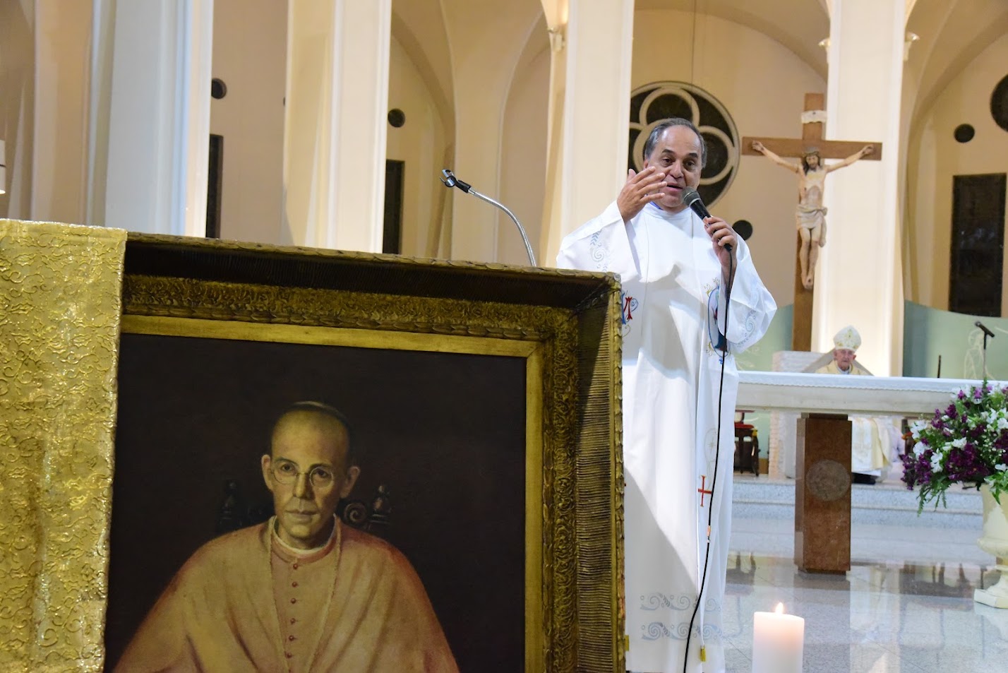 E agora nós rezamos para que ele, agora sendo modelo de virtude para todos nós também. Deus nos conceda, pela intercessão de Dom Lustosa um milagre, um sinal para que ele seja reconhecido como beato. Então, está na fase do milagre para beatificação. Por isso é importante você rezar em casa, levar aos enfermos para que eles rezem e rezem pelos enfermos, colocar as nossas causas a Deus por intercessão do venerável Dom Lustosa e que o Senhor na bondade, que é infinita, nos concede esse sinal para termos este grande homem, esse homem venerável, virtuoso, não é levado aos altares por meio deste milagre que Deus nos concederá.”