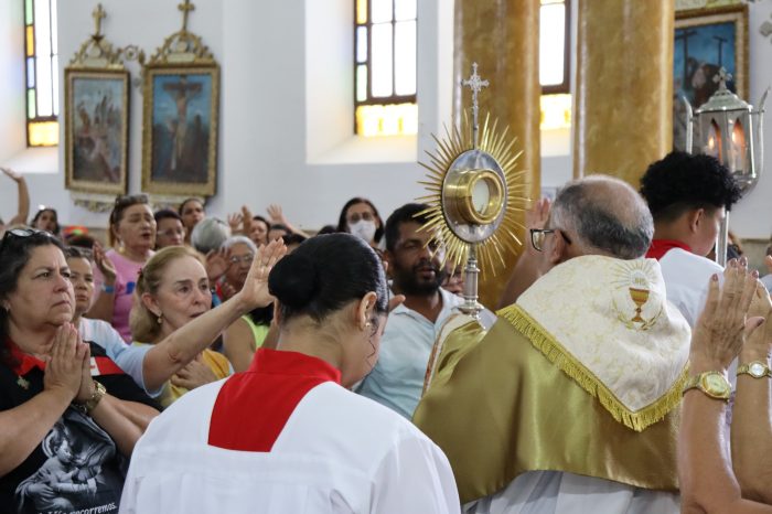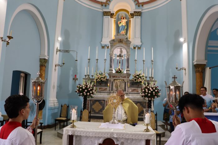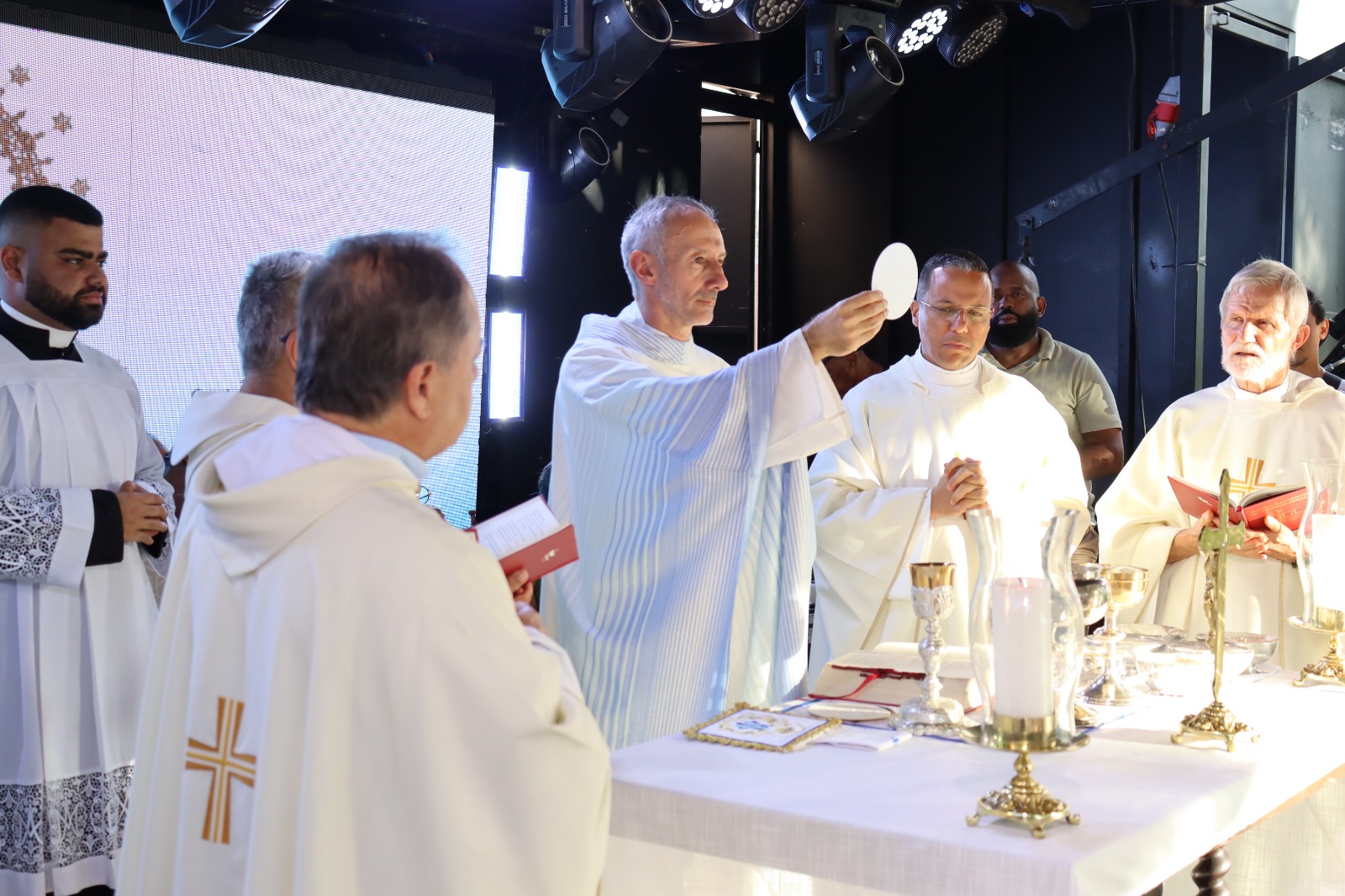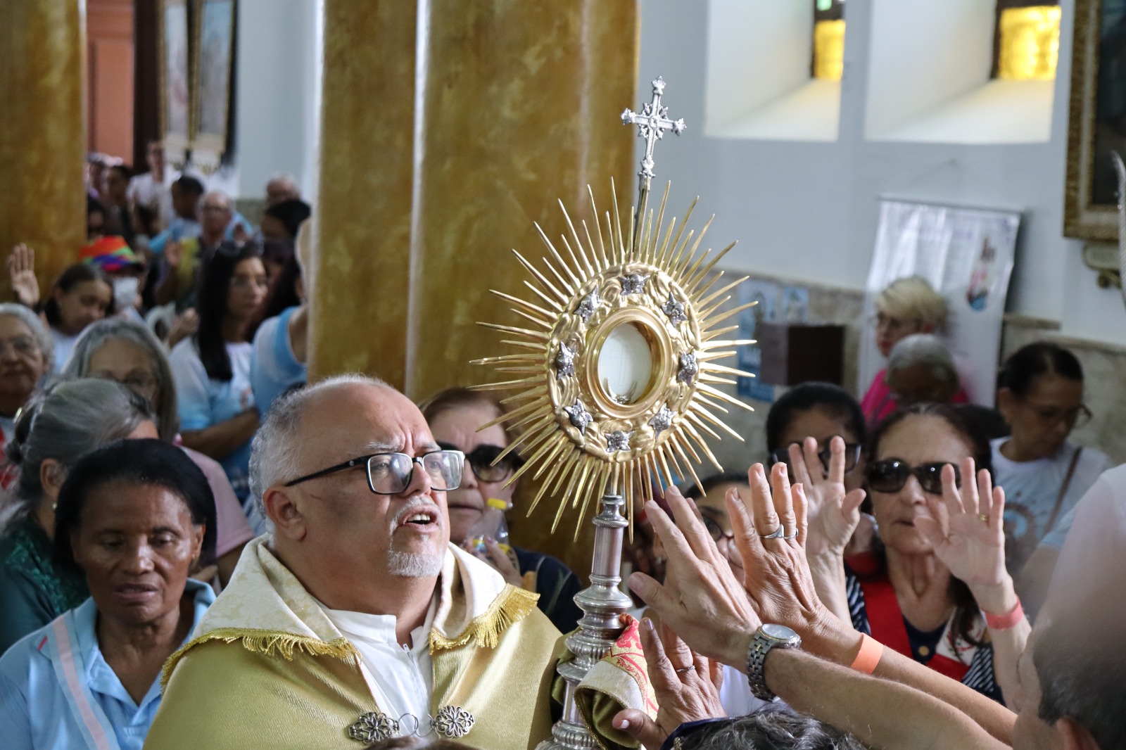 Às 11h, a Adoração ao Santíssimo Sacramento reuniu a comunidade em um profundo silêncio orante.