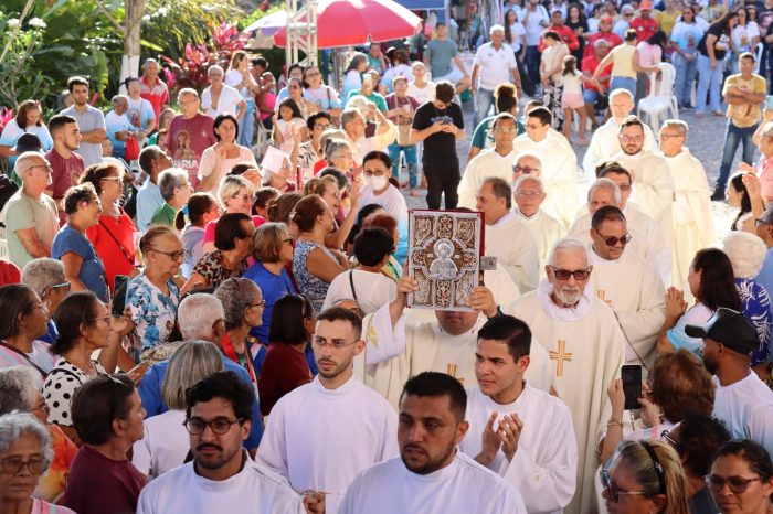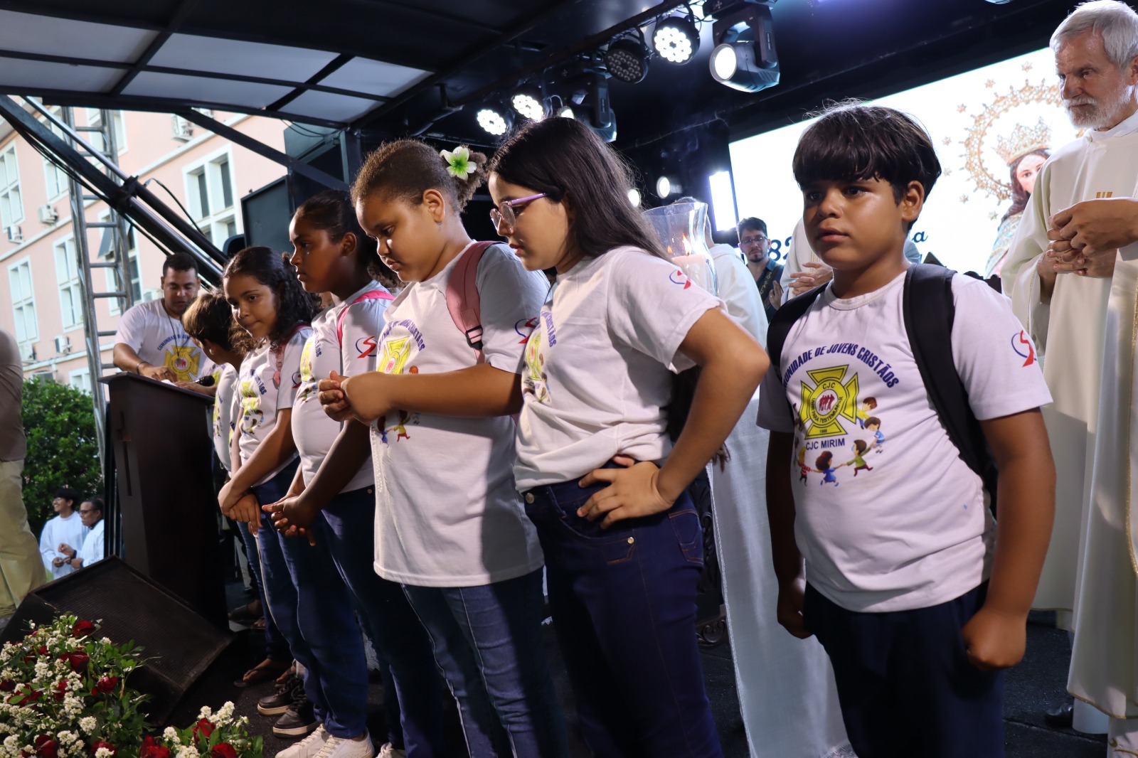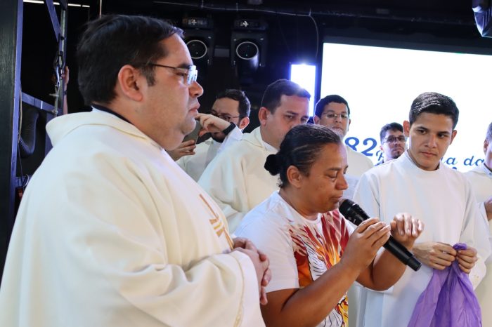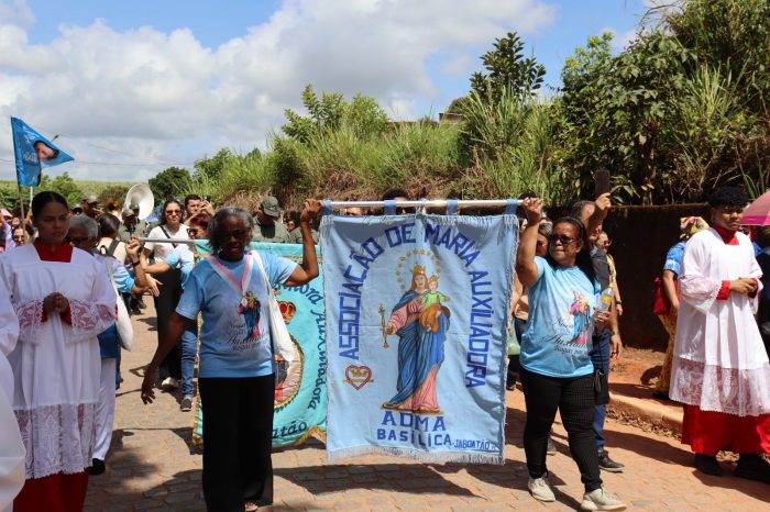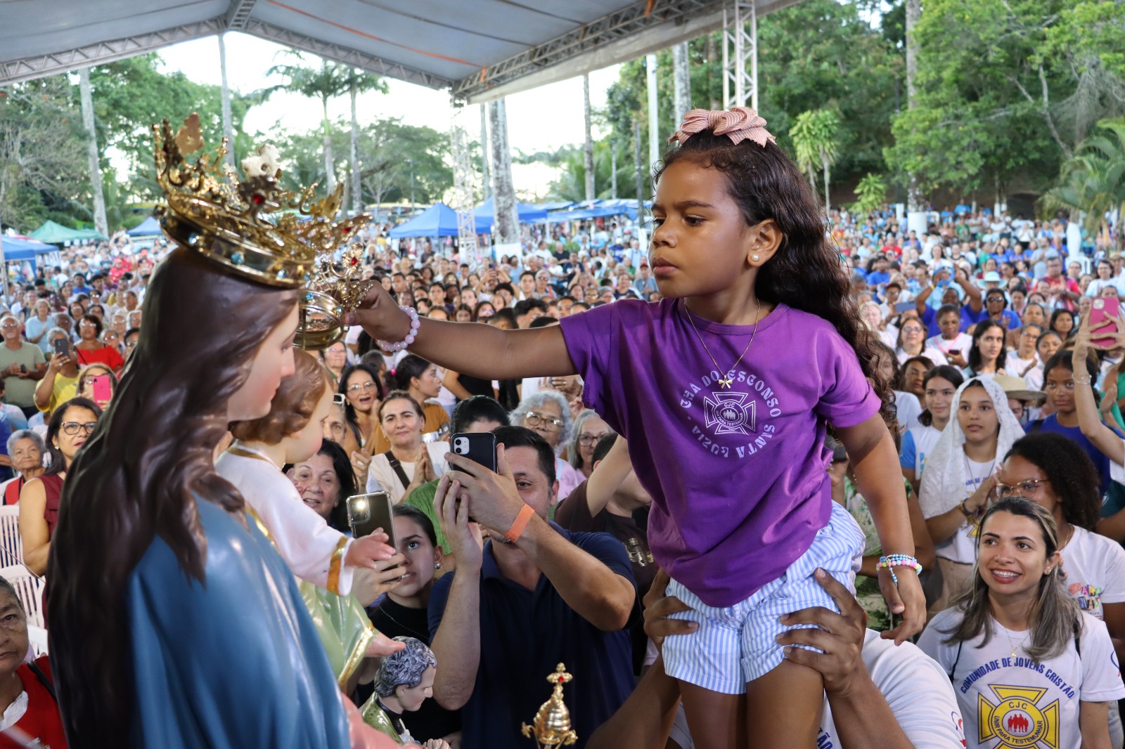A missa foi marcada por emoção e gratidão, culminando na coroação da imagem de Nossa Senhora Auxiliadora e sorteio da imagem peregrina, que, este ano, vai para a comunidade de Gramoré (Natal/RN). Crianças e jovens do Movimento CJC animaram o momento da coroação.