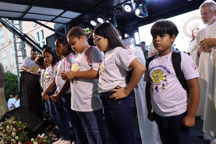 Em seguida, os participantes viveram momentos de piedade em diversos espaços da Colônia: o Terço na Basílica; o Ofício da Imaculada na Gruta, realizado pela ADMA do Sagrado Coração de Jesus sob a condução do Pe. Délio Mota; o Terço com jovens e crianças na escola, a Via Sacra e o Sacramento da Reconciliação.