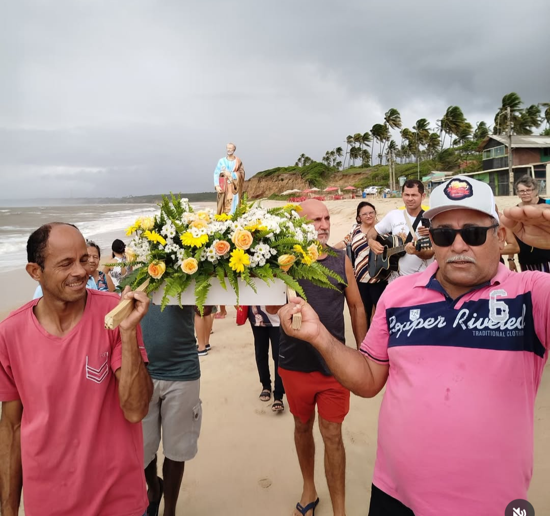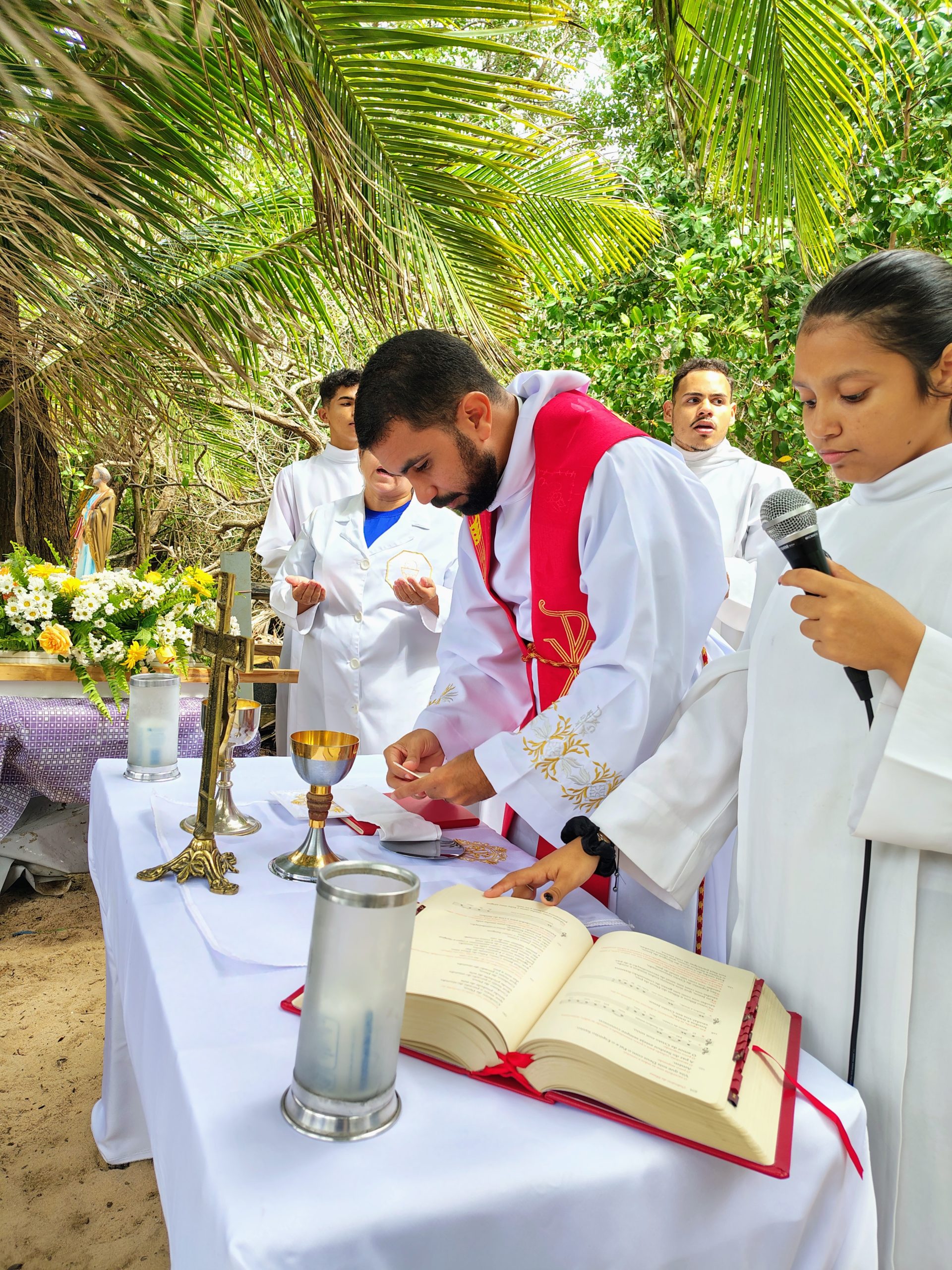A manhã começou com a procissão da imagem de São Pedro, acompanhada por cânticos e orações, partindo da comunidade até a praia de Jacarapé, onde foi montado um altar entre as palmeiras, tendo o mar como cenário. A simbologia da travessia, da pesca e da presença de Cristo junto aos pescadores foi intensamente vivida por todos.
