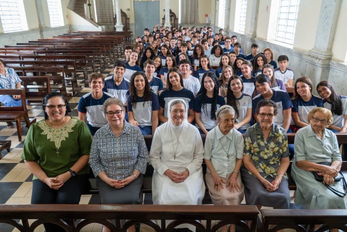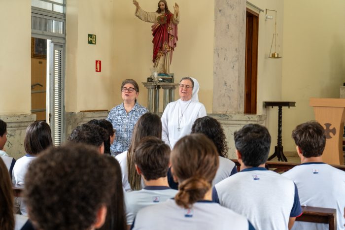 Em seguida, a Madre e as irmãs foram conduzidas pelos próprios estudantes até a capela do Colégio. No local, a Madre dirigiu uma mensagem especial aos presentes, recordando a importância da Jornada da Juventude e destacando palavras do Papa Leão XIV aos jovens, sobretudo no que se refere à necessidade de alimentar os sonhos.