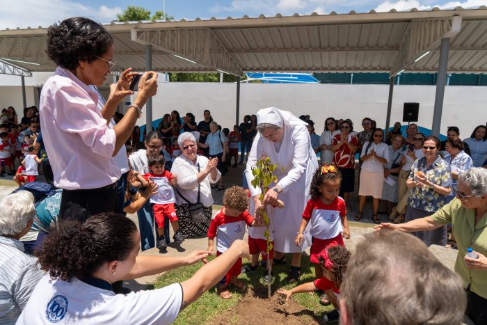 Encerrada a celebração na quadra, a comunidade dirigiu-se para o plantio do jequitibá, gesto simbólico que marcou o centenário. A árvore foi plantada pela Madre Geral, e cada irmã depositou um punhado de terra trazidas de suas comunidades, juntamente com crianças da Educação Infantil, que entoaram um canto alusivo ao “plantar o amor”. O momento reforçou o compromisso com a vida, a esperança e o futuro da missão salesiana.