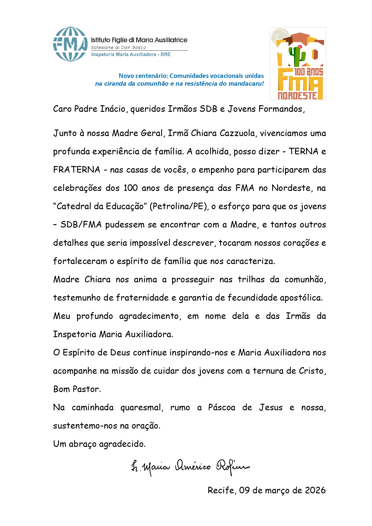 E, na ocasião, a Inspetora do Nordeste, Ir. Maria Américo, preparou uma carta para os salesianos da Inspetoria São Luiz Gonzaga.