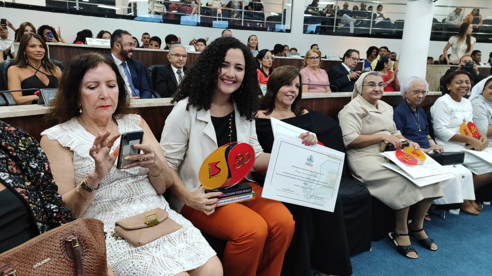 A presidente do SINEPE, Graça Bringel, falou sobre o trabalho da Aliança e a homenagem às escolas conveniadas à Câmara Municipal de Fortaleza. Além disso, a gestora da instituição, que também é professora, enfatizou que o ensino no Ceará é modelo para o resto do país.