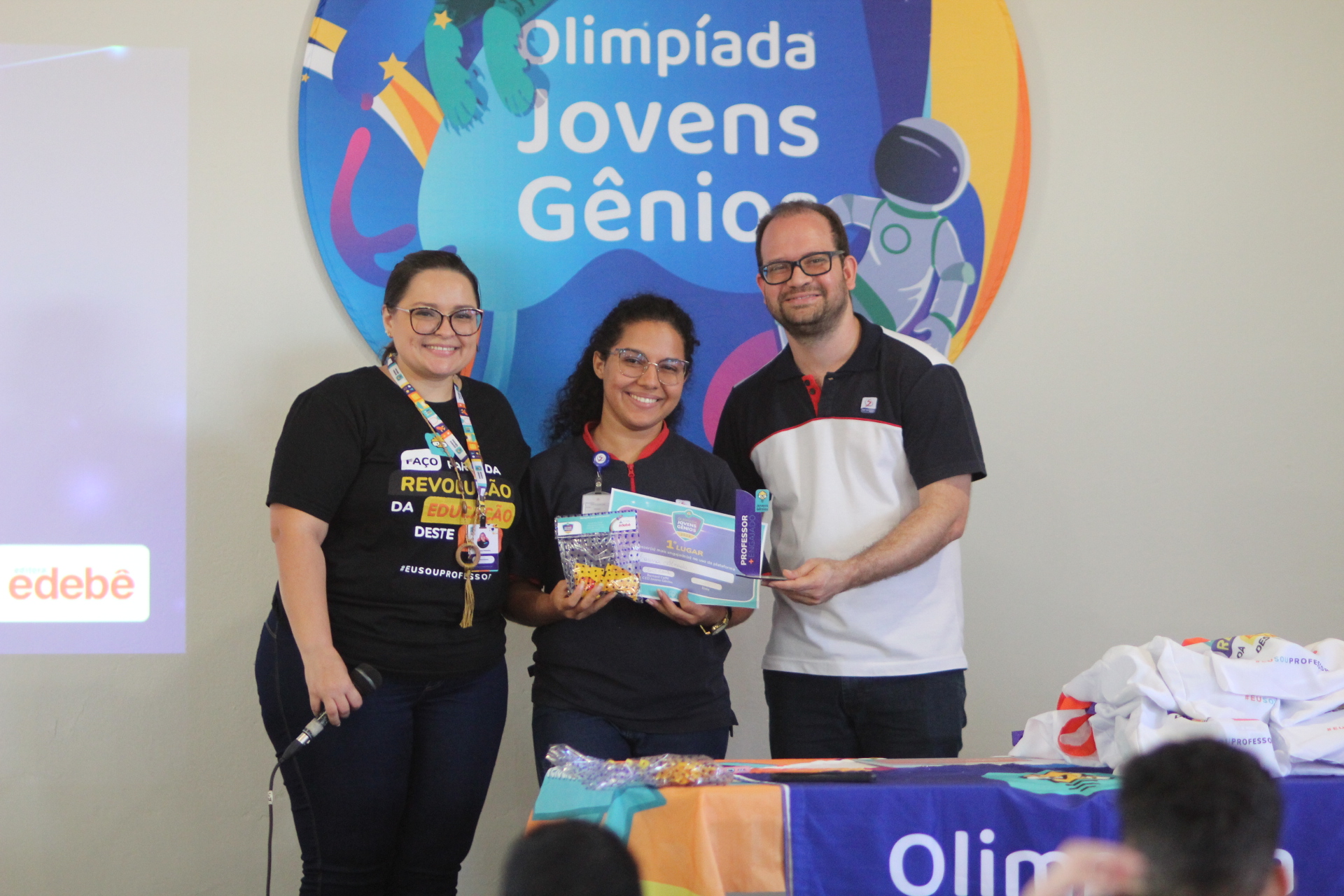 Além da premiação dos alunos, a Jovens Gênios premia o educador que mais que mais se empenhou no projeto auxiliando os alunos e professores nas atividades gameficadas. Esse ano a educadora Larissa Almeida recebeu o prêmio e o reconhecimento pelo excelente trabalho fornecido à escola.