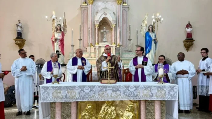 Comunicação 24 de fevereiro de 2026 Por paulo(Imagem: Padres salesianos durante a celebração eucarística presidida por Dom Gregório)