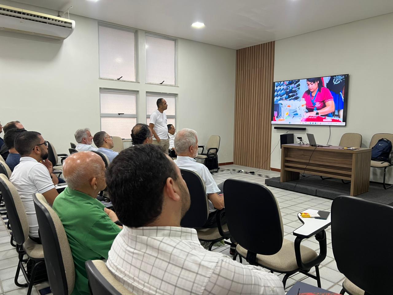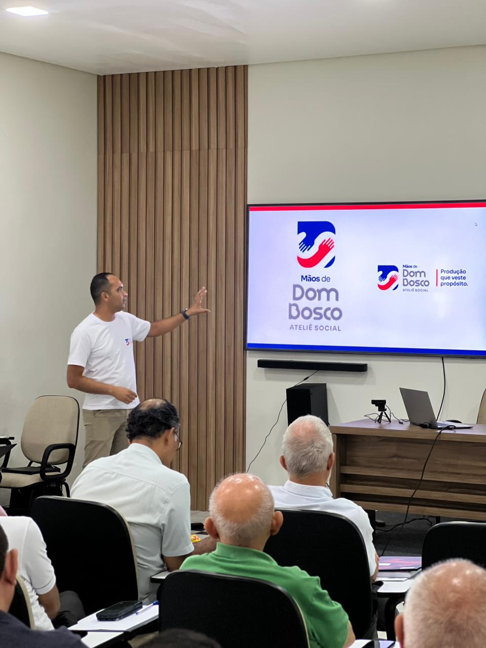 A apresentação foi feita pelo Pe. Eliano, diretor da obra, junto ao diretor geral Mário Cláudio, com o apoio técnico de Hélia, instrutora da oficina de Costura Industrial, que conduz e organiza todo o processo de confecção. Também esteve presente a equipe de comunicação da obra, garantindo registro e visibilidade desse momento significativo.