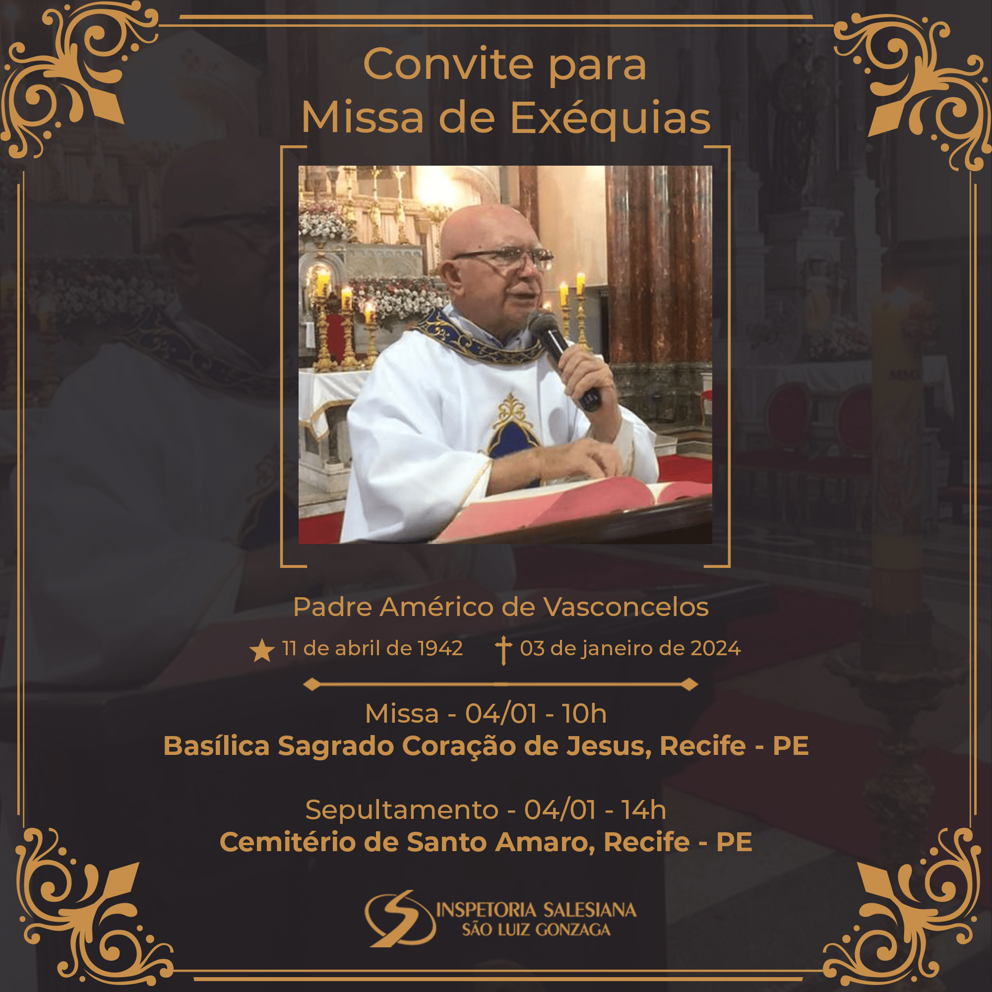 10:00 – Missa de Exéquias (Basílica Sagrado Coração de Jesus, Recife-PE).