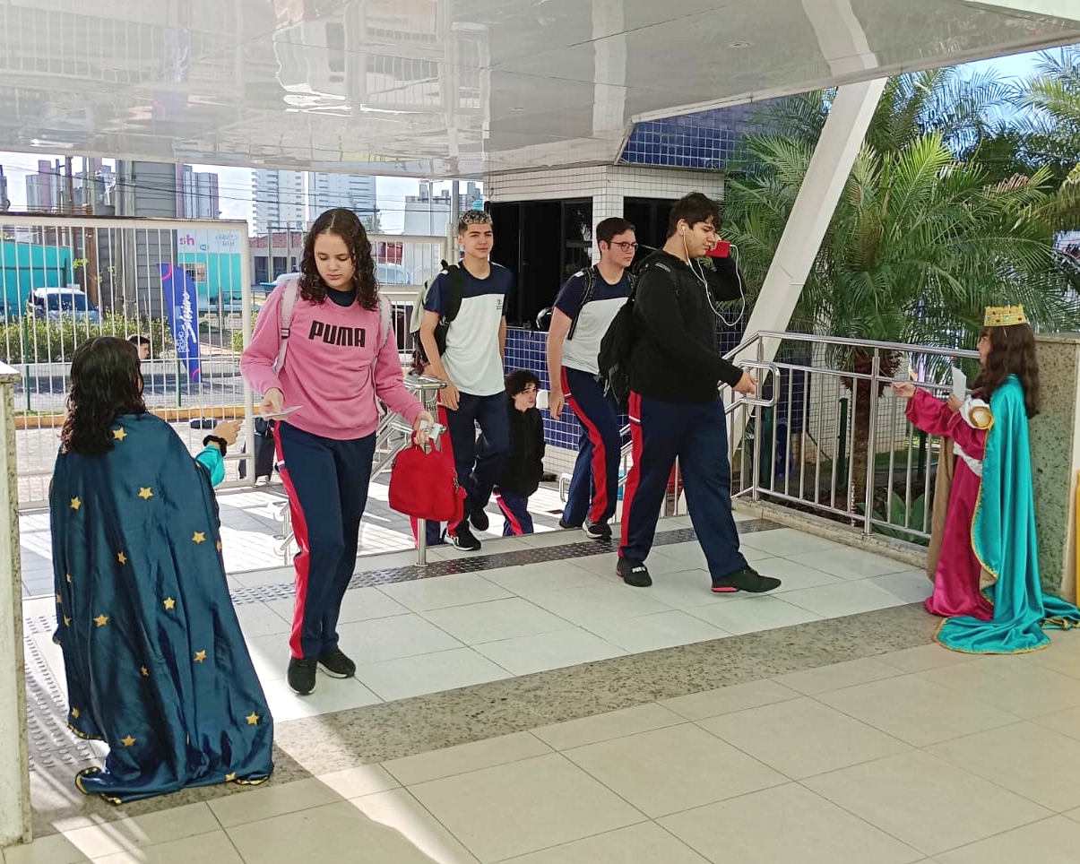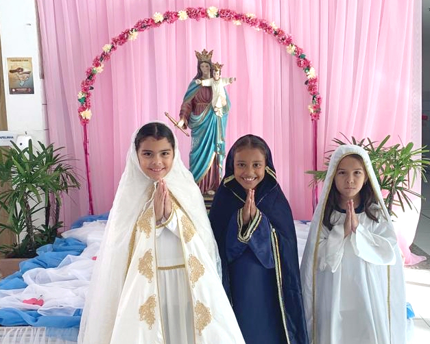 Alunas interpretando os títulos de Nossa Senhora entregaram mensagens especiais a todos que chegavam em nosso colégio.