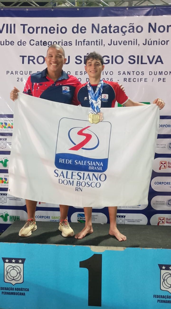 1 de abril de 2026 Por Renata CruzRepresentando com excelência o Salesiano RN, os educandos brilharam dentro e fora das piscinas! Um dos grandes destaques foi o atleta Guilherme Lemos Fontoura, da categoria Juvenil 1 (15 anos), que conquistou nada menos que 5 medalhas, sendo: ouro nos 50m e 100m nado peito e 100m nado costas, prata nos 200m nado peito e bronze nos 100m nado borboleta.