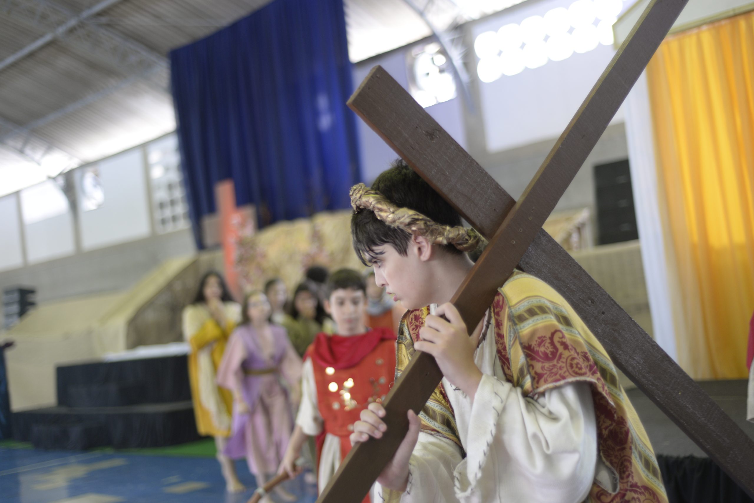 A encenação da Paixão de Cristo foi realizada no Ginásio do Colégio nos turnos matutino e vespertino para os alunos e educadores do Ensino Fundamental I, II e Médio. No turno da tarde, a apresentação foi aberta aos pais e colaboradores.